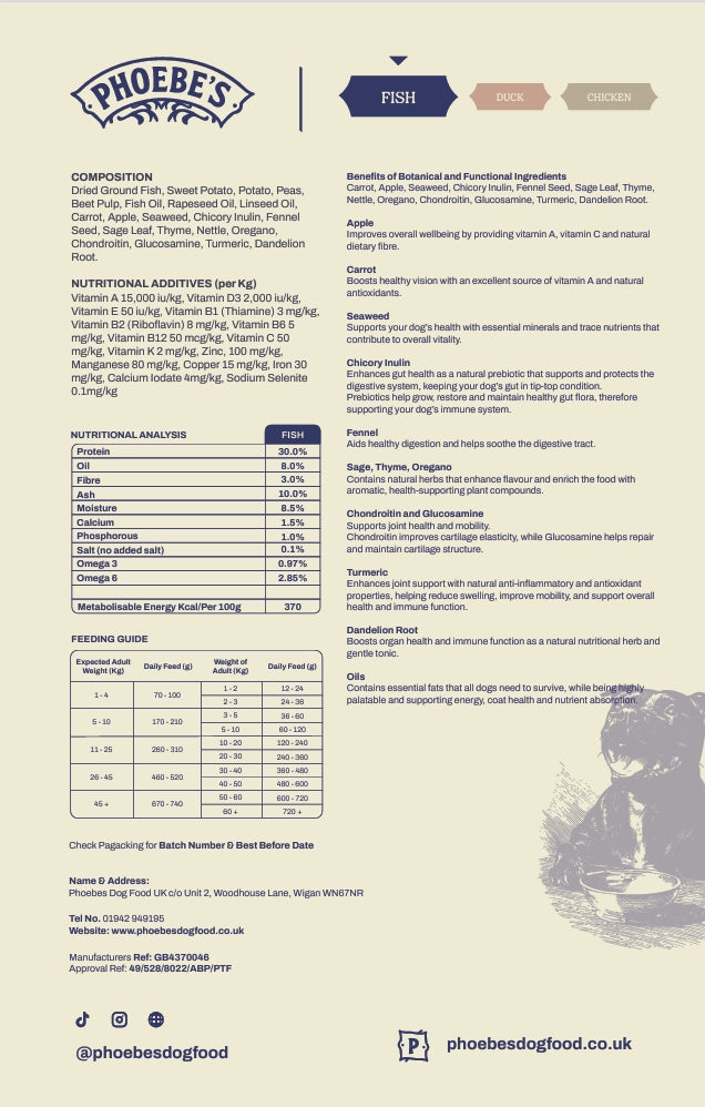 Dried Ground Fish 42% , Sweet Potato 27%, Potato 15%, Peas 5%, Beet Pulp 5%, Fish Oil 1.7%, Rapeseed Oil, Linseed Oil, Carrot, Apple, Seaweed, Chicory Inulin, Fennel Seed, Sage Leaf, Thyme, Nettle, Oregano, Glucosamine 108mg/kg Chondroitin 112.5mg/kg, Turmeric, Dandelion Root.